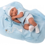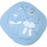 Elegantna 4-delna garderoba za lutko novorojenčka velikosti 35-36 cm vključuje okrasno odejico s pentljo. Popoln komplet za igro in stilizacijo vaše lutke.