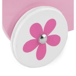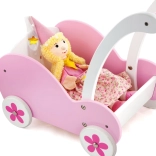 Rožnato-bela zasnova in cvetlični motivi na kolescih dajejo vozičku privlačen videz, ki spodbuja otroško domišljijo.
