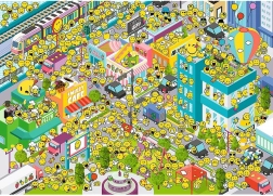 Vsak košček sestavljanke prinaša veselje pri sestavljanju in zabaven izziv najti določenega nasmejančka v živahnem mestnem okolju.