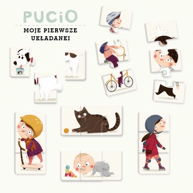 Škatla vsebuje 7 zelo preprostih sestavljank v velikosti 9 × 18 cm. Vsaka je razdeljena na 3 dele s tipičnimi zavihki za sestavljanje. Na posameznih slikah so prikazani glavni liki iz knjig Marty Galewske-Kustry in Joanne Kłos: Pucio, Miša, Bobo, mama, očka, pes Funia in mačka Mimi. Jasno in enotno ozadje olajša osredotočanje na slike, zato je igrača primerna za otroke že od enega leta.