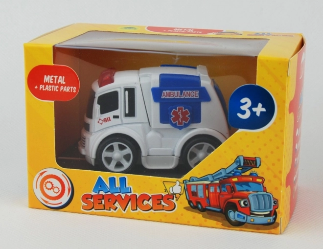 Kovinsko vozilo v škatliV ponudbi: gasilski avto, policijski avto, reševalno vozilo, bager.