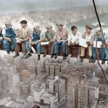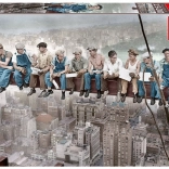 Slavni prizor delavcev na jeklenem nosilcu prinaša pristno vzdušje obdobja gradnje nebotičnikov.