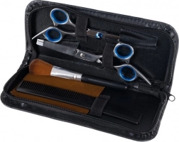 - škarje, degažirne škarje (27 zob), glavnik, čopič, čistilna krpica, frizersko ogrinjalo, etui