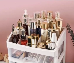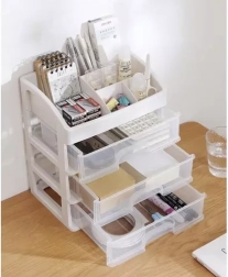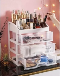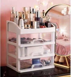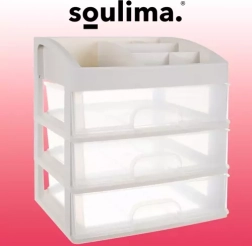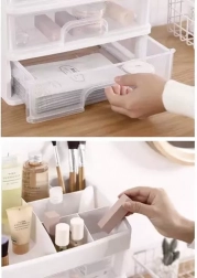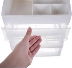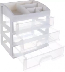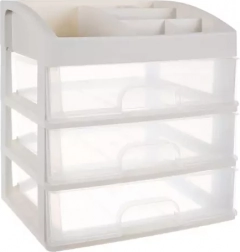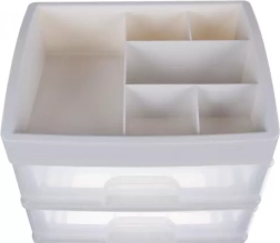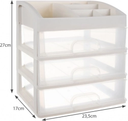 Praktičen plastičen organizator s 3 prozornimi predali in zgornjo polico s 6 predelki bo vaše kozmetične izdelke, nakit in pisarniške drobnarije ohranil pregledno na enem mestu. Zahvaljujoč transparentnim čelom boste vedno hitro našli, kar potrebujete, kompaktne mere pa so primerne za toaletno mizico, kopalnico in delovni prostor.