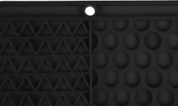 Podloga je protizdrsna zaradi močnih priseskov na spodnji strani – drži na gladkih površinah (kad, prha, ploščice) in na tleh. Izrastki nežno masirajo dlesni in pomagajo zmanjšati ostanke hrane v ustih, s čimer spodbujajo čistost in svež dah. Zaradi členjenih kanalčkov žival hrano pridobiva postopoma, kar upočasni goltanje in podpira boljšo prebavo.