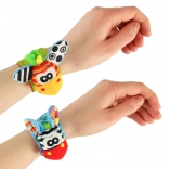 Prisrčni trakovi z živalicami pritegnejo dojenčka s kontrastnimi barvami in vzorci, mehkim blagom in različnimi teksturami za tip. Vsak gib ročice nagradi nežen zvok ropotuljice, ušeska pa skrivajo tudi šumečo folijo za dodatne senzorične vtise.