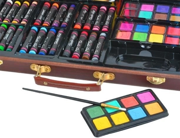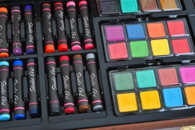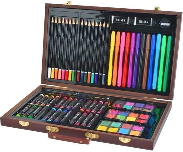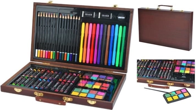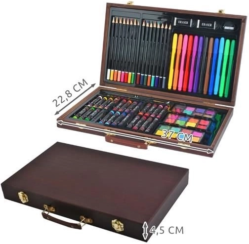 Popoln 81-delni slikarski komplet v elegantnem lesenem kovčku za začetnike in napredne. Vsebuje oljne pastele, akvarelne barve, flomastre in barvice, 2 čopiča, šilček, 2 radirki, risalni blok in pobarvanke. Zaradi preglednih predalčkov, kovinskih zaponk in udobnega ročaja je idealen za doma, v šoli in na poti.
