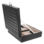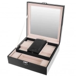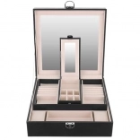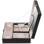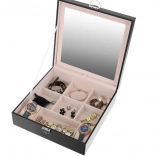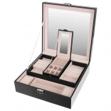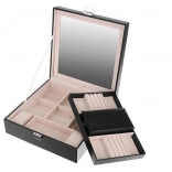 Ta škatla za nakit je odlična za vsako ljubiteljico nakita in modnih dodatkov. Ponuja večstopenjski prostor za shranjevanje, vključno z odstranljivo prenosno škatlico, kar ji daje vsestranskost in praktičnost, ki jo boste cenili na potovanjih. Ogledalo, integrirano v pokrovu, olajša nošenje nakita in prilagoditve.