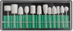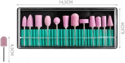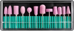 • 12 kamnitih rezkarjev in nastavkov – Narejeno iz taljenega aluminijevega oksida, primerno za suho in mokro delo. Idealno za manikuro, pedikuro in podologijo. Rezkarje je mogoče ponovno uporabiti in jih je mogoče sterilizirati ter razkužiti. Nastavki zagotavljajo higiensko delo.