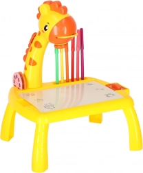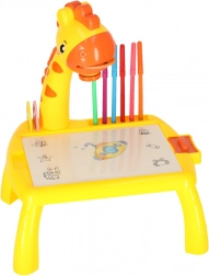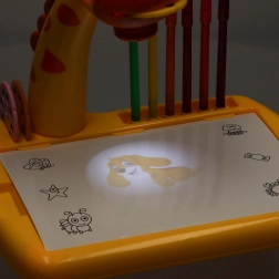 Ta prikupen namizni projektor v obliki žirafe popestri vsako ustvarjanje. Po vstavljanju enega od treh kolutov s slikami in vklopu projekcije se na površino projicira motiv, ki ga otroci zlahka obrišejo. Zahvaljujoč brisljivi podlogi lahko poskušajo znova in znova – brez zapravljanja papirja.