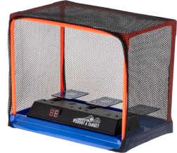 Vzdržljiva mreža z oranžnim okvirjem ujame penaste naboje in kroglice. Igrajte varno tudi v notranjih prostorih in brez truda ohranjajte red.