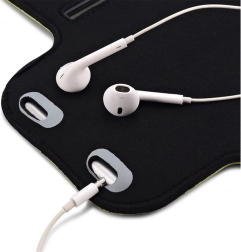 Nastavljiv pašček z ježkom zagotovi stabilen oprijem na nadlakti v obsegu približno 27–40 cm. Mehka neoprenska pena se prilagodi koži, zmanjšuje drsenje in povečuje udobje pri daljšem nošenju. Praktični izhodi za kabel slušalk omogočajo poslušanje glasbe tudi med intenzivnim treningom.