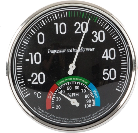 Analogni sobni termometer in higrometer je idealen za uporabo tako v notranjih kot zunanjih prostorih. Ponuja pregledne številčnice za natančno merjenje temperature in vlažnosti, kar je pomembno za okolja kot so skladišča, knjižnice ali prehrambne dejavnosti.