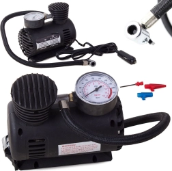 Paket vsebuje kompresor s cevjo, vtič za vžigalnik, manometer in komplet nastavkov za različne potrebe.