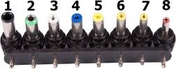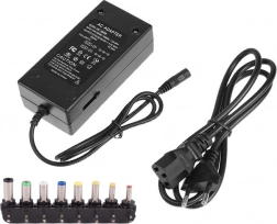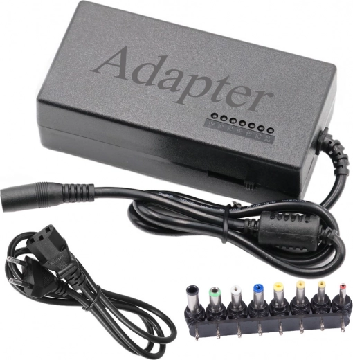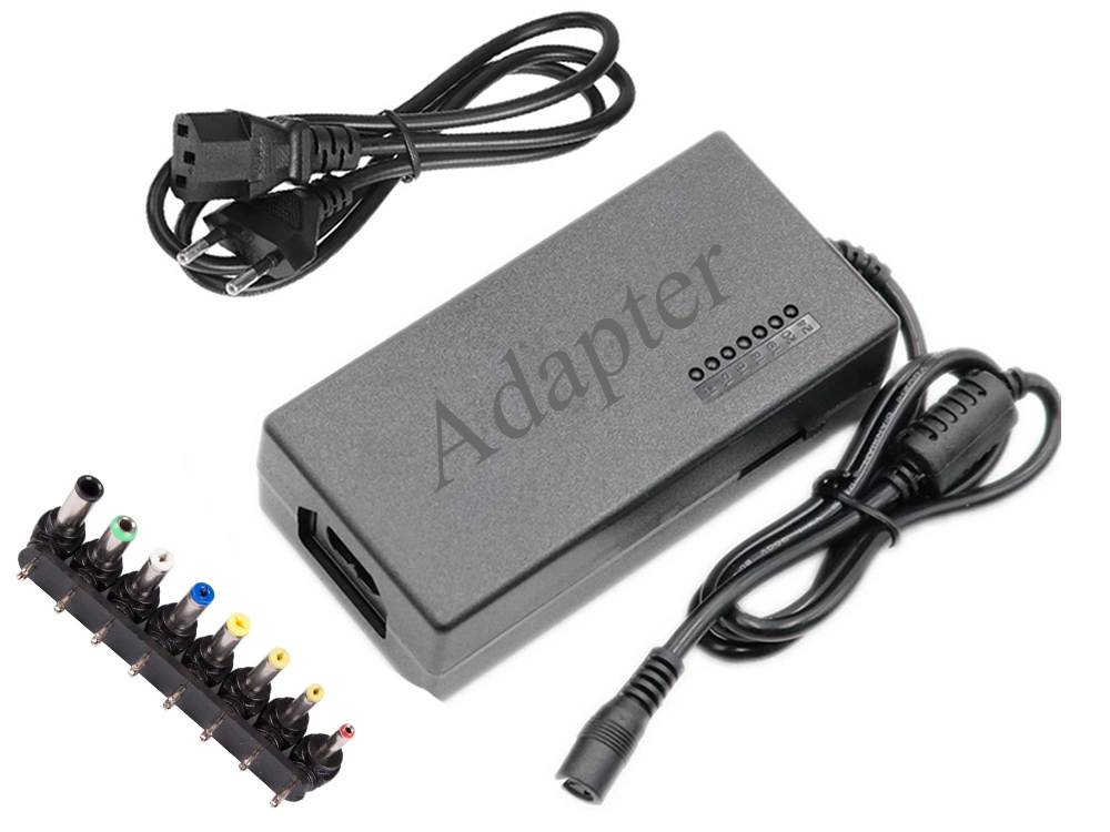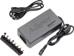 V paketu je 8 zamenljivih konektorjev, ki pokrivajo priljubljene znamke in modele prenosnikov (npr. ACER, ASUS, DELL, HP, LENOVO, SONY VAIO, TOSHIBA itd.). LED-diode prikazujejo trenutni način delovanja, stikalo za napetost pa omogoča hitro prilagoditev.