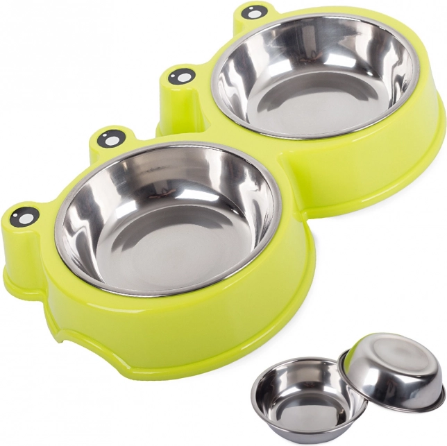 Dvojna posoda za pse in mačke je praktična rešitev, ki prihrani prostor in omogoča lahko čiščenje zahvaljujoč odstranljivim jeklenim posodam.