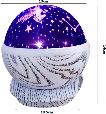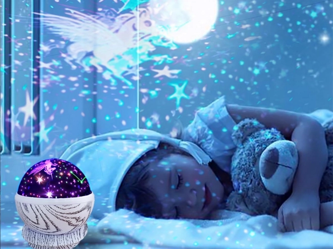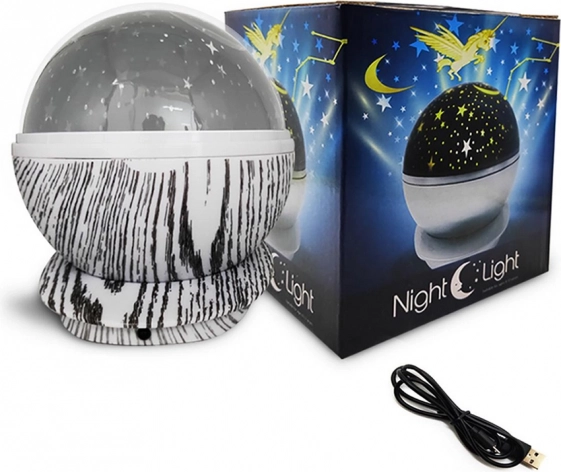 Ta elegantni projektor spremeni strop in stene v čarobno zvezdno nebo z luno. Zahvaljujoč 360° vrtenju ustvari dinamičen, pomirjujoč učinek, ki pomaga otrokom in odraslim lažje zaspati in se sprostiti. Je odlična dekoracija in praktična nočna svetilka.